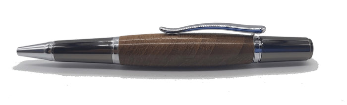 This is a beautiful quality pen Featuring Gun metal with chrome coloured fittings. The comfortable shape in the hand is complemented by the wonderful natural feel and warmth of the wood with a traditional wax finish.