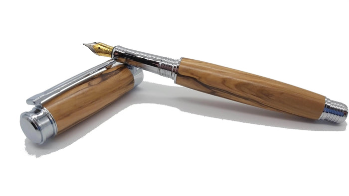 This is a quality handmade wooden fountain pen dressed in Bethlehem Olive wood with Chrome coloured fittings.