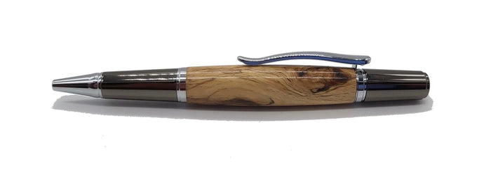 A lovely ball point twist pen handmade in Stabilised Spalted Cherry from Buckland Abbey Dartmoor with Chrome and Gunmetal coloured fittings. The comfortable shape in the hand is complemented by the wonderful natural feel and warmth of the wood with a traditional wax finish.