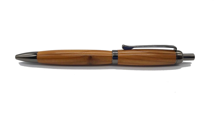 Quality handmade wooden ballpoint click pen handmade in striking Elm from Dartmoor. The pen features Gun metal coloured fittings which perfectly compliment the wood.