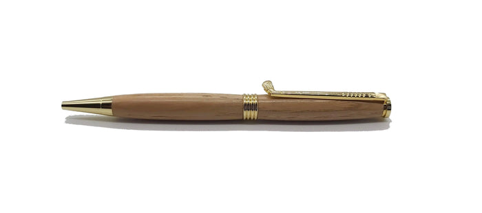 Quality handmade wooden ballpoint twist pen handmade in Hickory wood from a pre 1930's golf club shaft. The pen features gold metal coloured fittings with a golf club styled clip. A great golfers gift idea.