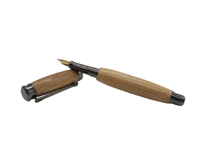Fountain pen handmade Oak taken from an old used Jack Daniel's whisky cask. The pen features gunmetal, gold or chrome coloured fittings which perfectly compliment the wood and make a for a unique looking pen.