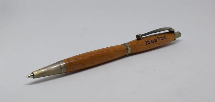 This is a beautiful handmade propelling pencil with Antique Bronze coloured fittings. The comfortable shape in the hand is complemented by the wonderful natural feel and warmth of the wood. The pencil has laser engraving as pictured saying "Phoenix Wharf". The wood in this pen was taken from Phoenix Wharf Plymouth during the ongoing restoration in preparation for the Mayflower 400 celebrations in the city in 2020.