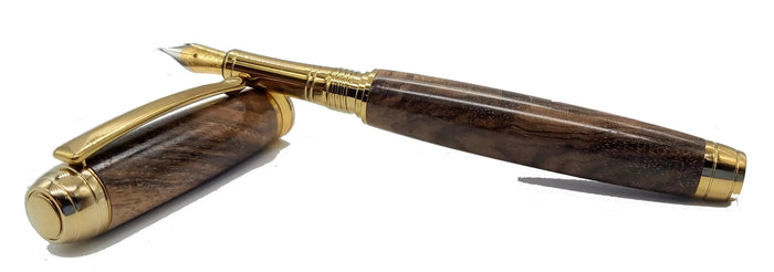 Wooden fountain pen, handmade in stunning stabilised Turkish Walnut. The comfortable shape in the hand is complemented by the wonderful natural feel and warmth of the wood with a final coat of wax finish.