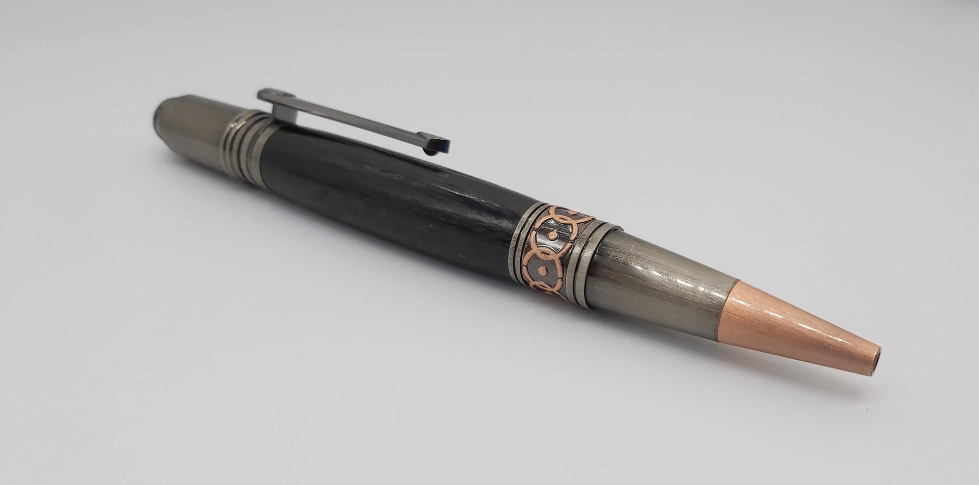 Quality handmade wooden ballpoint twist pen handmade in English Fenland Bog Oak. The pen features Gun polish & Antique Rose Copper coloured fittings which perfectly compliment the wood.
