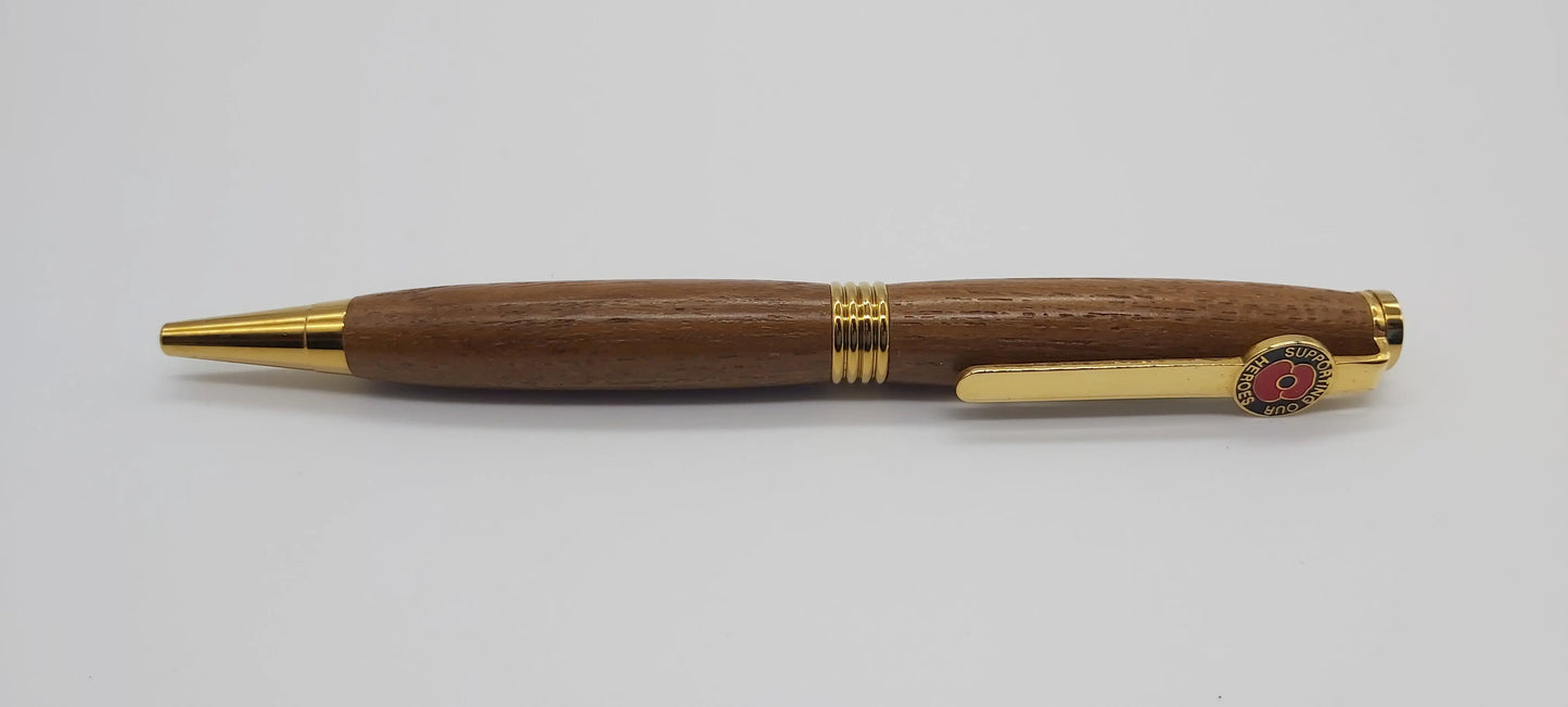 This is a beautiful pen with the teak complemented by Gold coloured fittings The comfortable shape in the hand is complemented by the wonderful natural feel and warmth of the wood with a traditional wax finish. The pen features a Supporting our Heroes clip as shown.